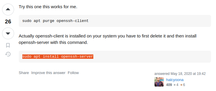 이는 기존에 설치되어 있는 openssh-client와의 의존성과 관련된 문제로, 아래 코드를 입력함으로써 해결할 수 있습니다.