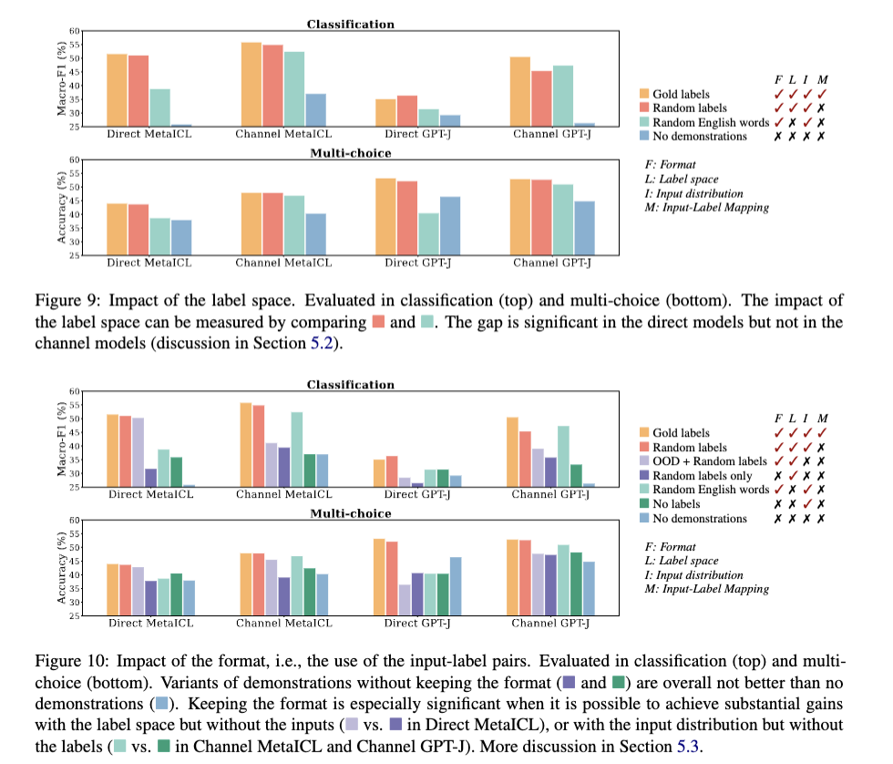 제목 그대로 모델이 ICL을 통해 학습하는 방법과 프롬프트의 어떤 측면이 분류 및 객관식 문제와 같은 최종 작업 수행에 기여하는지에 대해 설명합니다. 그리고 입력 및 출력 공간에 대한 정답 여부는 중요하지 않으며, 적절한 출력을 얻기 위해서는 라벨 공간, 입력 텍스트의 분포, 순서의 전체 형식(label space, distribution of input text, and overall format of sequence)과 같은 특징이 중요하다고 말합니다.