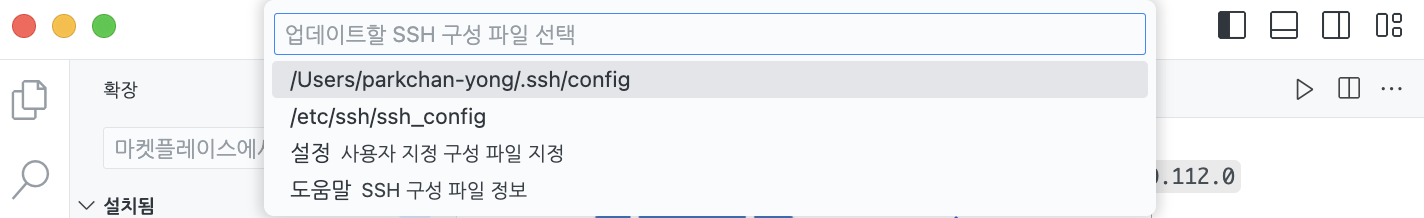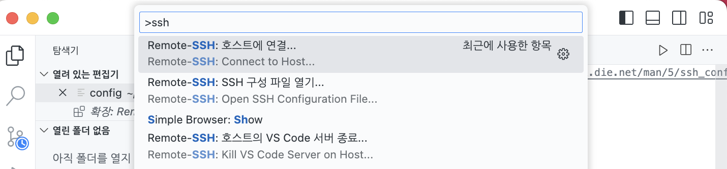 검색창에서 ctrl + shift + p를 누른 뒤 ssh를 입력하거나 >ssh를 입력하고 'SSH 구성파일 열기'를 클릭합니다.
