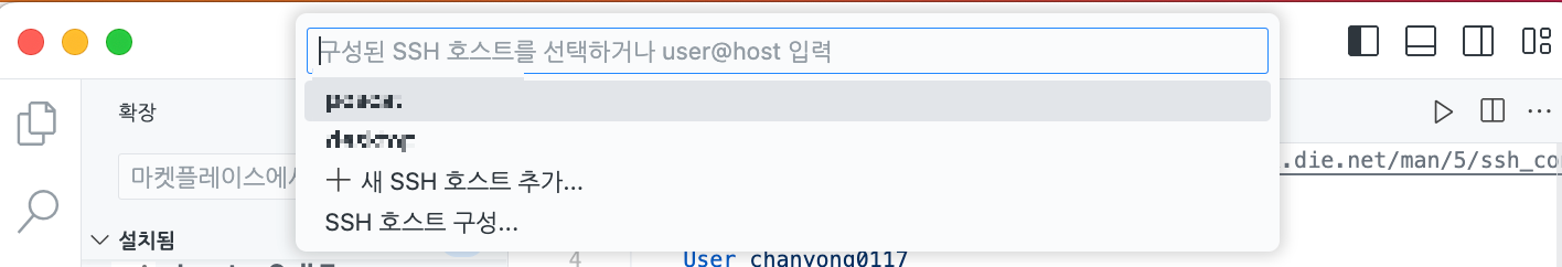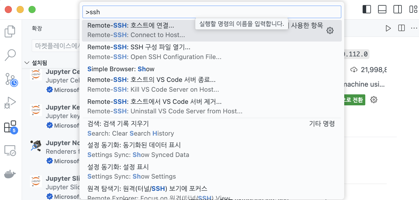 검색창에서 ctrl + shift + p를 누른 뒤 ssh를 입력하거나 >ssh를 입력하고 '호스트에 연결'을 클릭합니다.