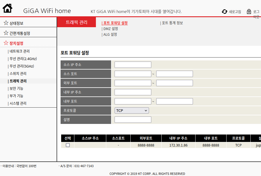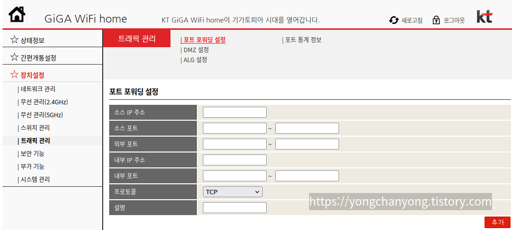 트래픽 관리에 접속하여 포트포워딩을 설정해줍니다.