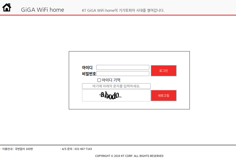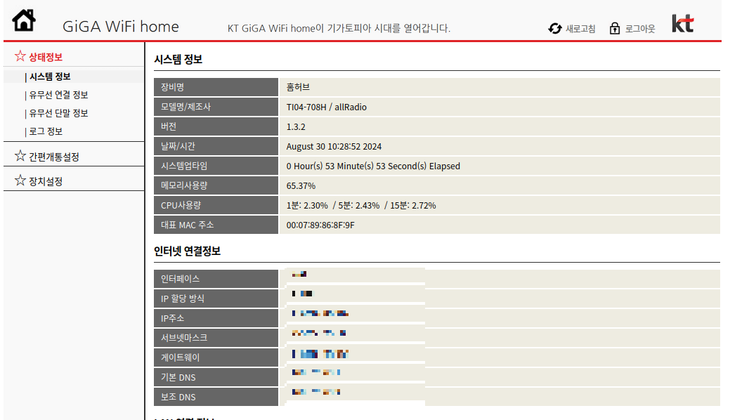 kt 공유기의 경우, 아래 주소로 접속하면 아래와 같은 화면이 나오게 됩니다.