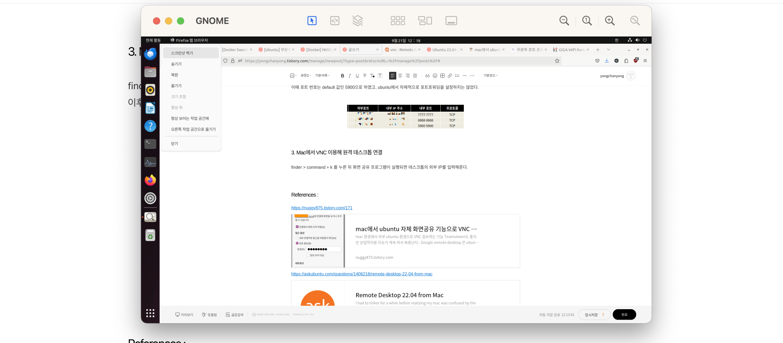 mac 환경에서 외부 ubuntu 환경으로 VNC 접속하는 기능 Teamviewer도 좋지만 상업적이용 이슈가 계속 떠서 짜증난다.. Google remote desktop 은 ubuntu 환경에서 아직 오류가 많은 듯 하다. 외부 Ubuntu 환경 ubuntu
