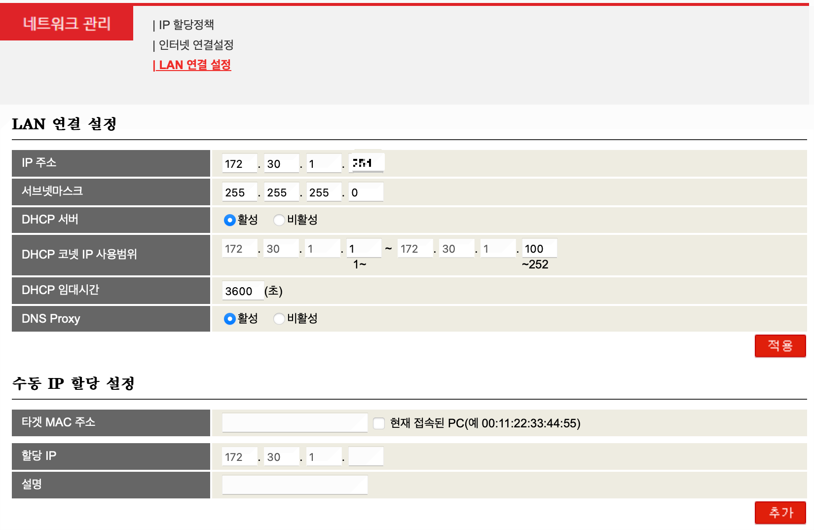 라우터 관리자 페이지에 접속하여 수동 IP를 설정합니다. 이는 장치에 고정된 내부 IP를 부여해 네트워크 환경이 재설정되더라도 장치 IP가 유지되도록 합니다.