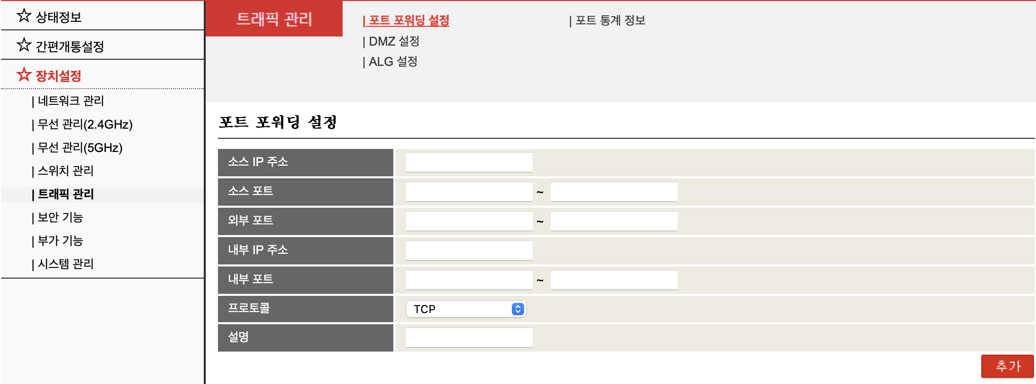 1. 장치 설정 -> 트래픽 관리에 가서 외부 포트, 내부 포트에 원하는 포트 번호를 입력합니다.