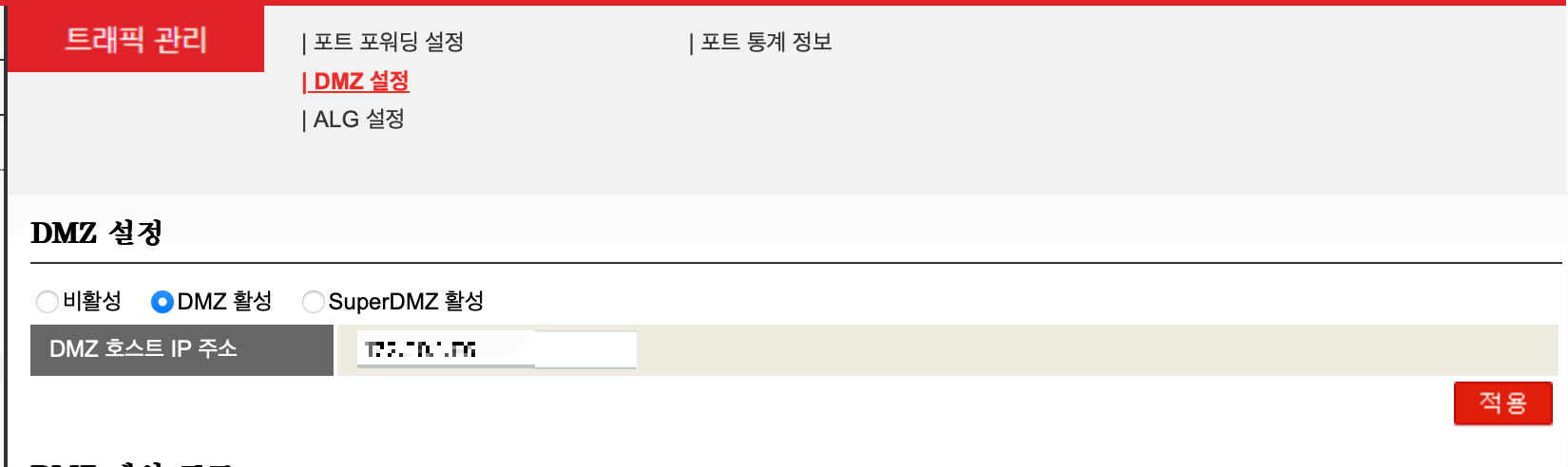 1. 장치 설정 -> 트래픽 관리에 가서 DMZ 설정을 누르고 DMZ 활성을 누릅니다.