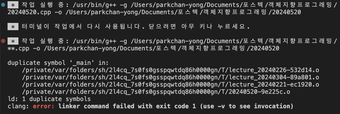 터미널을 보았을 때, 분할 컴파일을 할 때는 "${fileDirname}/**.cpp"을 사용해야 하고,